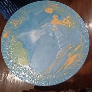 When I began painting this circle pine tabletop, the mix of blues, white, and gold instantly made me happy — it looked alive, almost like the Earth itself. That’s why I call it New Earth. The tabletop seems to speak to you with its movement and depth.