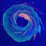 When I made this painting, I wanted to push beyond my first black hole piece — to make it burst with color and energy. I imagined myself staring straight into the black hole, being pulled toward its center.