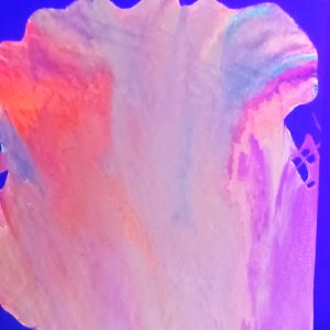 Painted by Talana, this work glows with pink, yellow, and green neon. The colors don’t just sit side by side—they flow into one another, sparking a sense of joy. As they meet and blend, you feel the happiness inside you rise, like the painting is lighting you from within. This blacklight painting was created with teenagers in mind, blending bold colors and a sense of play that comes alive under UV light.