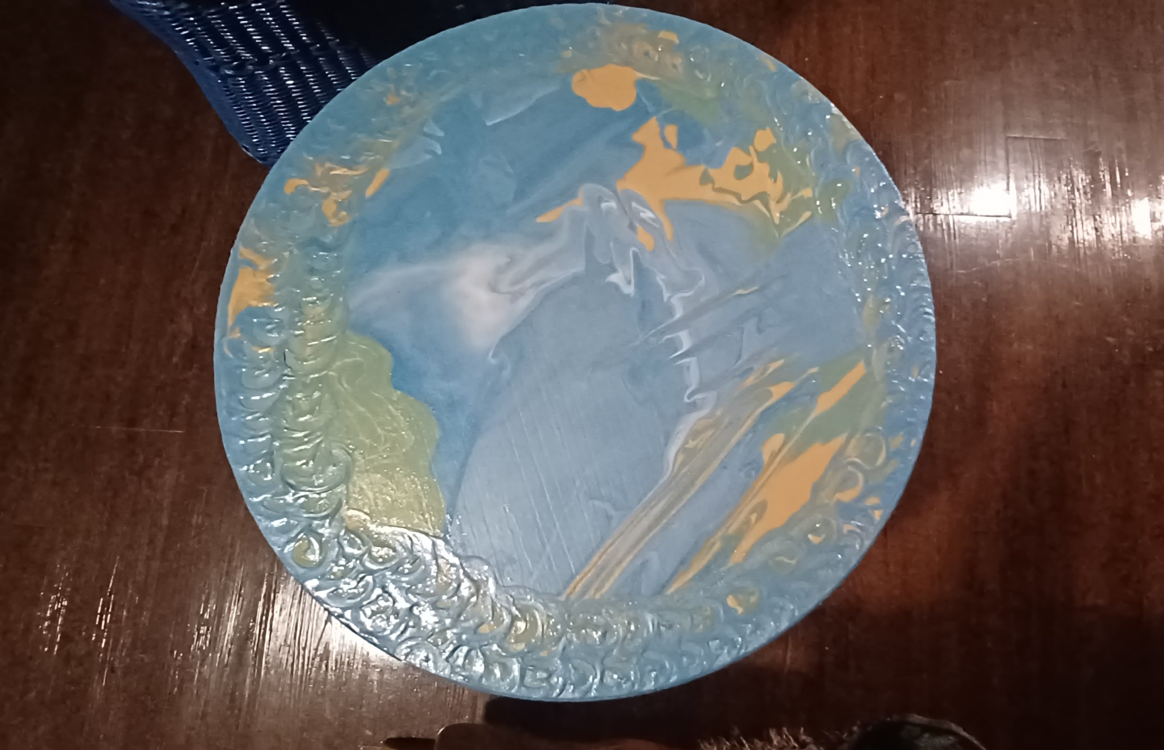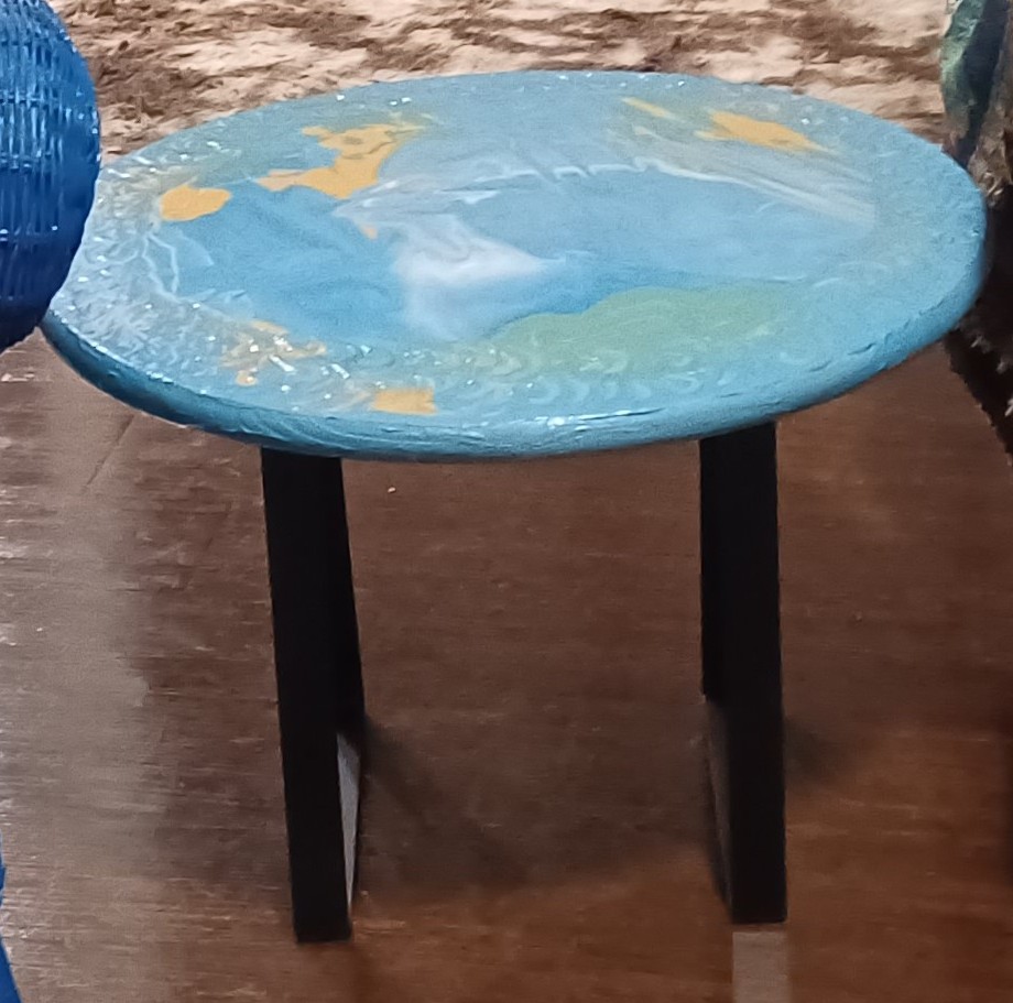 When I began painting this circle pine tabletop, the mix of blues, white, and gold instantly made me happy — it looked alive, almost like the Earth itself. That’s why I call it New Earth. The tabletop seems to speak to you with its movement and depth.