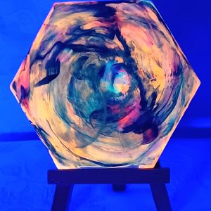 Custom made neon pour-painted tile — designed to glow under blacklight, perfect for adding bold energy to a teen’s room.