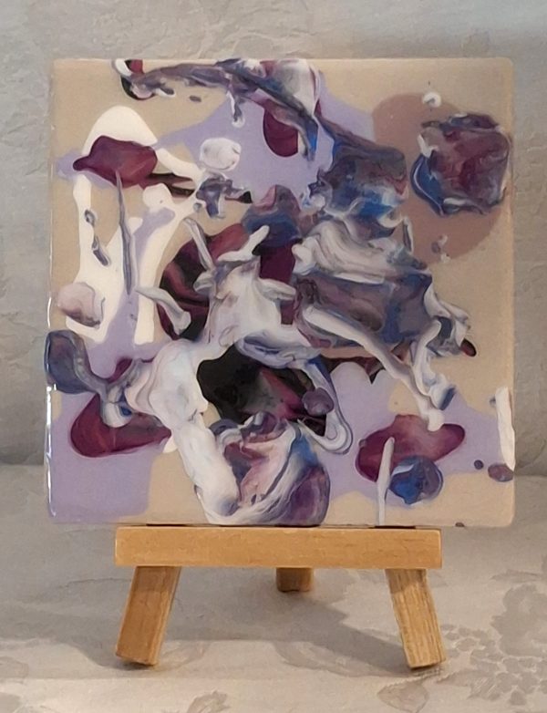 This 4 x 4 ceramic tile was created with pour paint. We use 3-4 colors of pour paint to create a design that the customer can decorate their home with. All tiles come with an easel.